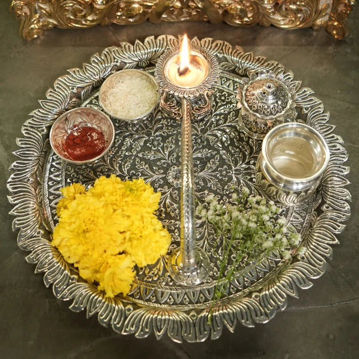 Elevate your rituals with this antique 92.5% silver pooja thali, featuring a beautiful floral design, a handcrafted peacock diya, a water vessel, kumkum & rice katori, and a silver agarbatti stand. Perfect for worship & gifting.