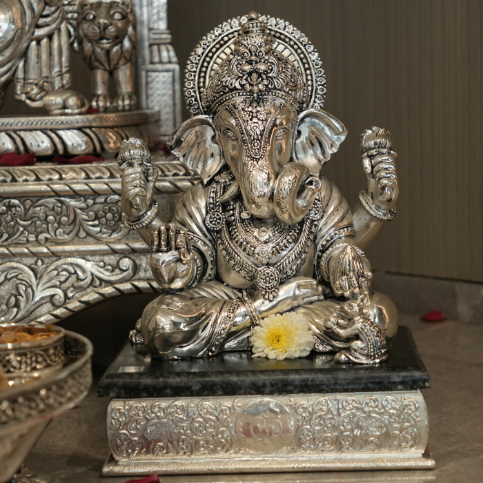 This Silver Ganesha Murti is a divine representation of Lord Ganesh, the remover of obstacles and the bringer of prosperity and good fortune. Crafted with high-quality silver, this Lord Ganesh Idol is perfect for pooja ceremonies, festivals, or as a sacred addition to your home decor. Its detailed craftsmanship and serene expression bring a sense of peace and spiritual blessings to your space. Invite divine blessings and enhance your home’s spiritual ambiance with this exquisite Silver Ganesh Idol.