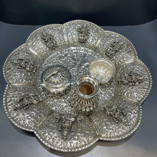 Celebrate your devotion with the Pure Ashtalakshmi Pooja Thali from Maharani by Rungtas. a premium silver creation of 92.5% purity, this thali features stunning artwork of Ashtalakshmi, the goddess of wealth and prosperity. Its elegant design makes it ideal for both everyday use and special poojas.