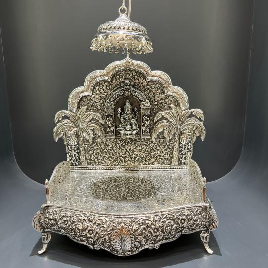 Bring divine elegance to your home with the Dhanlaxmi Floral Design Puja Mandir from Maharani by Rungtas. This gorgeous mandir has beautiful floral designs in antique silver and is carefully created from premium 92.5% pure silver. is ideal for designing a calm and exquisite place of worship. Its classic look and sturdy design make it a cherished addition to your spiritual practices.