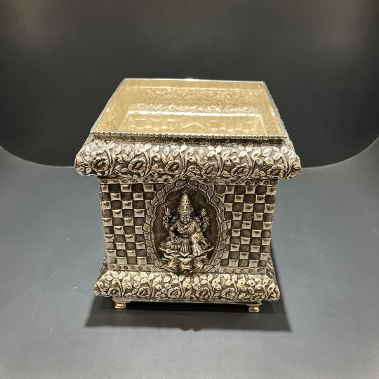Infuse your pooja rituals with grace using the Exclusive Tulsi Pot Lakshmi from Maharani by Rungtas. Crafted from high-quality 92.5% pure silver. This silver pot, showcasing exquisite craftsmanship and the serene image of Goddess Lakshmi, is ideal for creating a peaceful spiritual environment. A perfect gift for loved ones or a beautiful addition to your home decor.