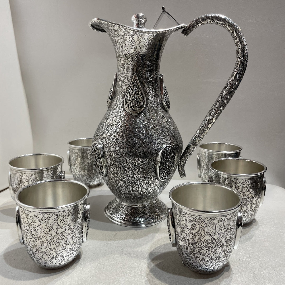 Enhance your table with our Silver Antique Jug Set. This set features a beautifully crafted silver jug and matching glasses with an elegant antique design. It’s perfect for adding a classic touch to your meals and special gatherings. Make every drink special with this sophisticated jug set from Maharani by Rungtas.