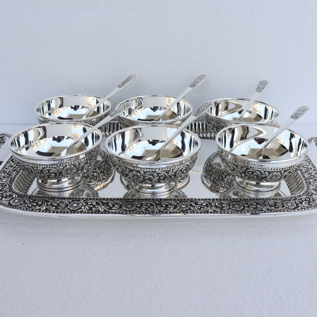 Add a touch of elegance to your dessert time with this beautiful Silver Floral Design Ice Cream Bowl from Maharani by Rungtas. Crafted from high-quality 92.5% pure silver, this bowl features a delicate floral pattern that enhances its charm. Perfect for serving ice cream, sorbet, or other sweet treats, it's both stylish and practical. The smooth finish and intricate design make it a lovely addition to any table setting. Ideal for special occasions or everyday use, this bowl combines beauty with functionality.