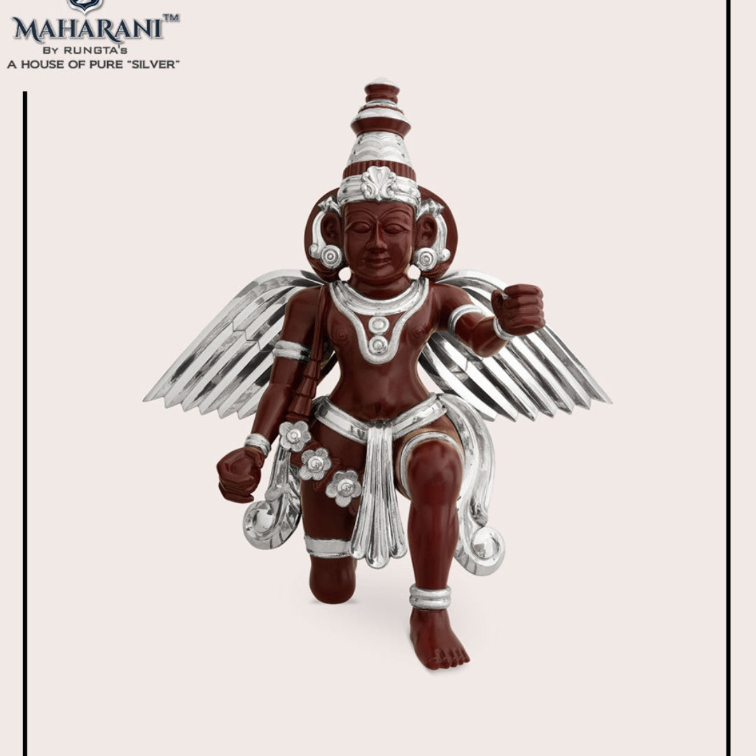 Bring divine blessings into your home with the Silver Fusion Garud Ji Idol from Maharani by Rungtas. This exquisite idol, crafted with high-quality silver, showcases Garud Ji in a majestic and serene pose. The intricate detailing and elegant design make it a perfect addition to your spiritual decor. Ideal for gifting on auspicious occasions, this idol is a symbol of protection and devotion. Embrace the divine presence of Garud Ji with this beautiful silver idol.