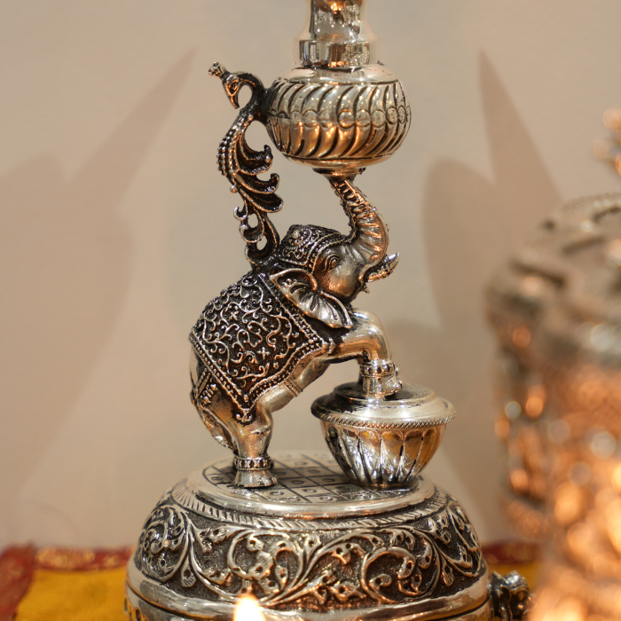 Elevate your space with this exquisite Silver Samay Diya Lamp, featuring intricate designs of a majestic peacock on top and a graceful elephant holding the lamp at the bottom. Perfect for lighting up your pooja room, home decor, or gifting during festive occasions, this lamp beautifully blends cultural heritage with timeless craftsmanship.